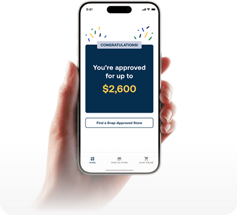 ²Snap-branded product offering includes retail installment contracts, bank installment loans, and lease-to-own financing. Talk with your local Snap merchant for more details on which product qualifies at your store location. For more detailed information, please visit https://snapfinance.com/legal/products